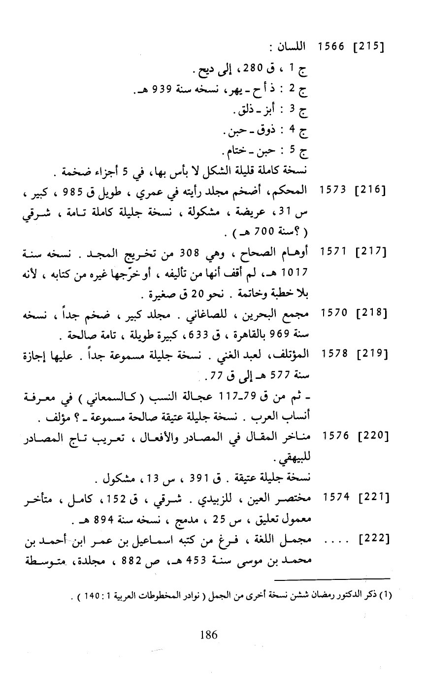 [216] ... 1573 ... المحكم، أضخم مجلد رأيته في عمري، طويل ق 985، كبير، س 31، عريضة، مشكولة، نسخة جليلة كاملة تامة، شرقي (؟ سنة 700 هـ).