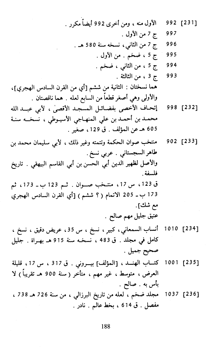 [235] ... 1001 ... كتاب الهند، [المؤلف] بيروني. ق 317، س 17، قليلة العرض، متوسط، غير مهم، متأخر (سنة 900 هـ تقريبًا) لا بأس به. صالح.