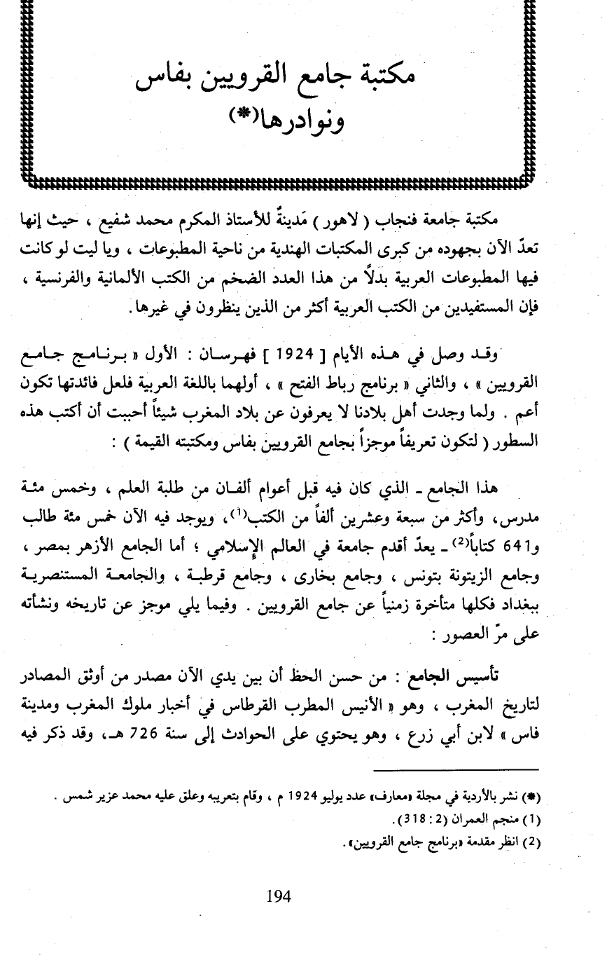 وقد وصل في هذه الأيام [1924]، فهرسان: الأول "برنامج جامع القرويين"، والثاني "برنامج رباط الفتح"، أولهما باللغة العربية فلعل فائدتها تكون أعم. ولما وجدت أهل بلادنا لا يعرفون عن بلاد المغرب شيئًا أحببت أن أكتب هذه السطور (لتكون تعريفًا موجزًا بجامع القرويين بفاس ومكتبته القيمة):