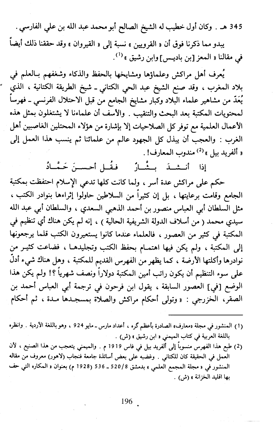 (¬2) طبع هذا الفهرس منسوبًا إلى ألفريد بيل في فاس 1919 م. والميمني يتعجب من هذا الصنيع، لأن العمل في الحقيقة كان للكتاني. وغضبه على بعض أساتذة جامعة فنجاب (لاهور) معروف من مقاله المنشور في "مجلة المجمع العلمي" بدمشق 8/ 520 - 536 (1928 م) بعنوان "المكاره التي حف بها إقليد الخزانة" (ش).