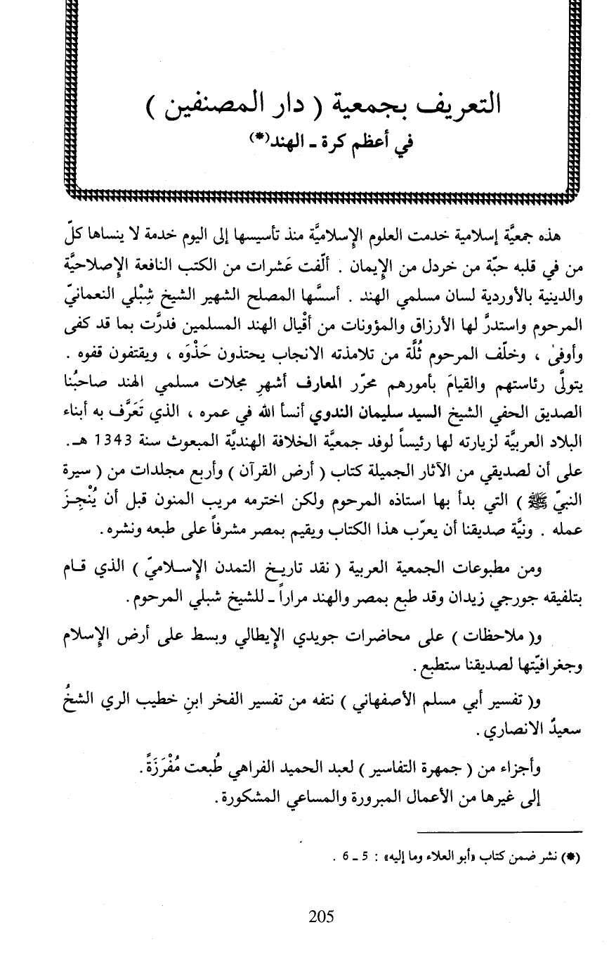هذه جمعيَّة إسلامية خدمت العلوم الإِسلاميَّة منذ تأسيسها إلى اليوم خدمة لا ينساها كل من في قلبه حبّة من خردل من الإيمان. ألّفت عَشرات من الكتب النافعة الإصلاحيَّة والدينية بالأوردية لسان مسلمي الهند. أسسَّها المصلح الشهير الشيخ شِبْلي النعمانيّ المرحوم واستدرَّ لها الأرزاق والمؤونات من أقْيال الهند المسلمين فدرَّت بما قد كفى وأوفى، وخلّف المرحوم ثُلَّة من تلامذته الانجاب يحتذون حَذْوَه، ويقتفون قفوه. يتولى رئاستهم والقيامَ بأمورهم محرّر المعارف أشهرِ مجلات مسلمي الهند صاحبُنا الصديق الحفي الشيخ السيد سليمان الندوي أنسأ الله في عمره، الذي تَعَرف به أبناء البلاد العربيَّة لزيارته لها رئيسًا لوفد جمعيّة الخلافة الهنديَّة المبعوث سنة 1343 هـ. على أن لصديقي من الآثار الجميلة كتاب (أرض القرآن) وأربع مجلدات من (سيرة النبيّ - صلى الله عليه وسلم -) التي بدأ بها استاذه المرحوم ولكن اخترمه مريب المنون قبل أن يُنْجِزَ عمله. ونيَّة صديقنا أن يعرّب هذا الكتاب ويقيم بمصر مشرفًا على طبعه ونشره.
