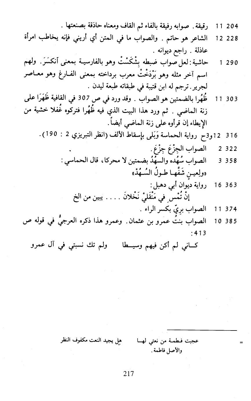 228 ... 12 الشاعر هو حاتم. والصواب ما في المتن أي أريني فإنه يخاطب امرأة عاذلة. راجع ديوانه.