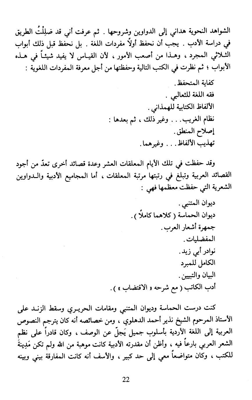 كنت درست الحماسة وديوان المتنبي ومقامات الحريري وسقط الزند على الأستاذ المرحوم الشيخ نذير أحمد الدهلوي، ومن خصائصه أنه كان يترجم النصوص العربية إلى اللغة الأردية بأسلوب جميل يَجلّ عن الوصف، وكان قادرًا على نظم الشعر العربي بارعًا فيه، وأظن أن مقدرته الأدبية كانت موهبة من الله ولم تكن مَدينةَ للكتب، وكان متواضعًا معي إلى حد كبير، والأسف أنه كانت المفارقة بيني وبينه