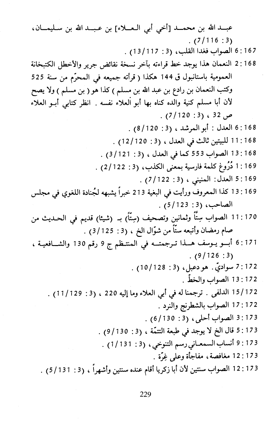168: 2 النعمان هذا يوجد خط قراءته بآخر نسخة نقائض جرير والأخطل الكتبخانة العمومية باستانبول ق 144 هكذا (قرأته جميعه في المحرّم من سنة 525 وكتب النعمان بن راح بن عبد الله بن مسلم) كذا هو (بن مسلم) ولا يصح لأن أبا مسلم كنية والده كناه بها أبو العلاء نفسه. انظر كتابي أبو العلاء ص 32، (3: 120/ 7).