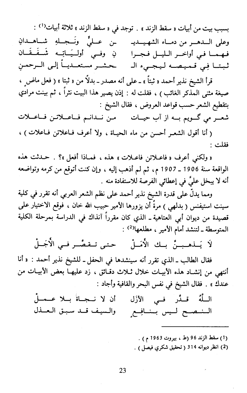 قرأ الشيخ نذير أحمد "ثبتًا" -على أنه مصدر- بدلًا من " ثبتا" (فعل ماضٍ، صيغة مثنى المذكر الغائب)، فقلت له: إذن يصير هذا البيت نثرًا، ثم بينت مرادي بتقطيع الشعر حسب قواعد العروض، فقال الشيخ: