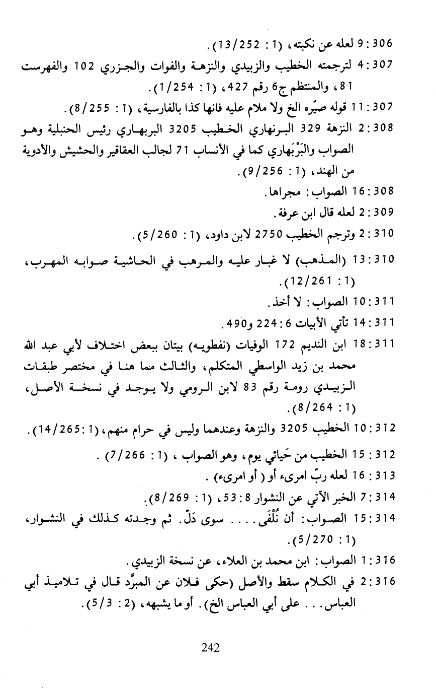 307: 4 لترجمته الخطيب والزبيدي والنزهة والفوات والجزري 102 والفهرست 81، والمنتظم ج 6 رقم 427، (1: 254/ 1).