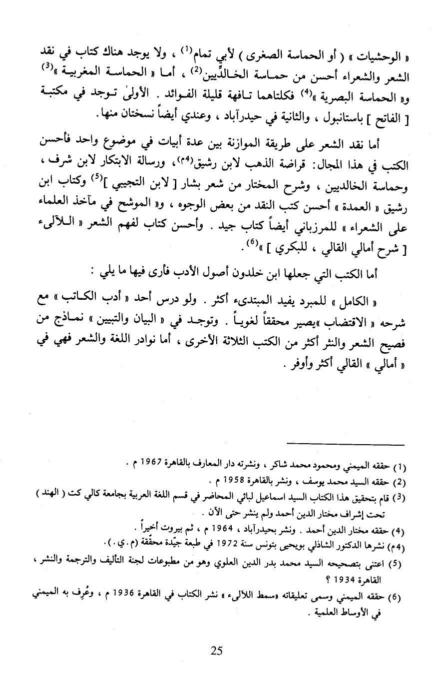 "الوحشيات" (أو الحماسة الصغرى) لأبي تمام (¬1)، ولا يوجد هناك كتاب في نقد الشعر والشعراء أحسن من حماسة الخالدِّيين (¬2)، أما "الحماسة المغربية" (¬3) و"الحماسة البصرية" (¬4) فكلتاهما تافهة قليلة الفوائد. الأولى توجد في مكتبة [الفاتح] باستانبول، والثانية في حيدرآباد، وعندي أيضًا نسختان منها.