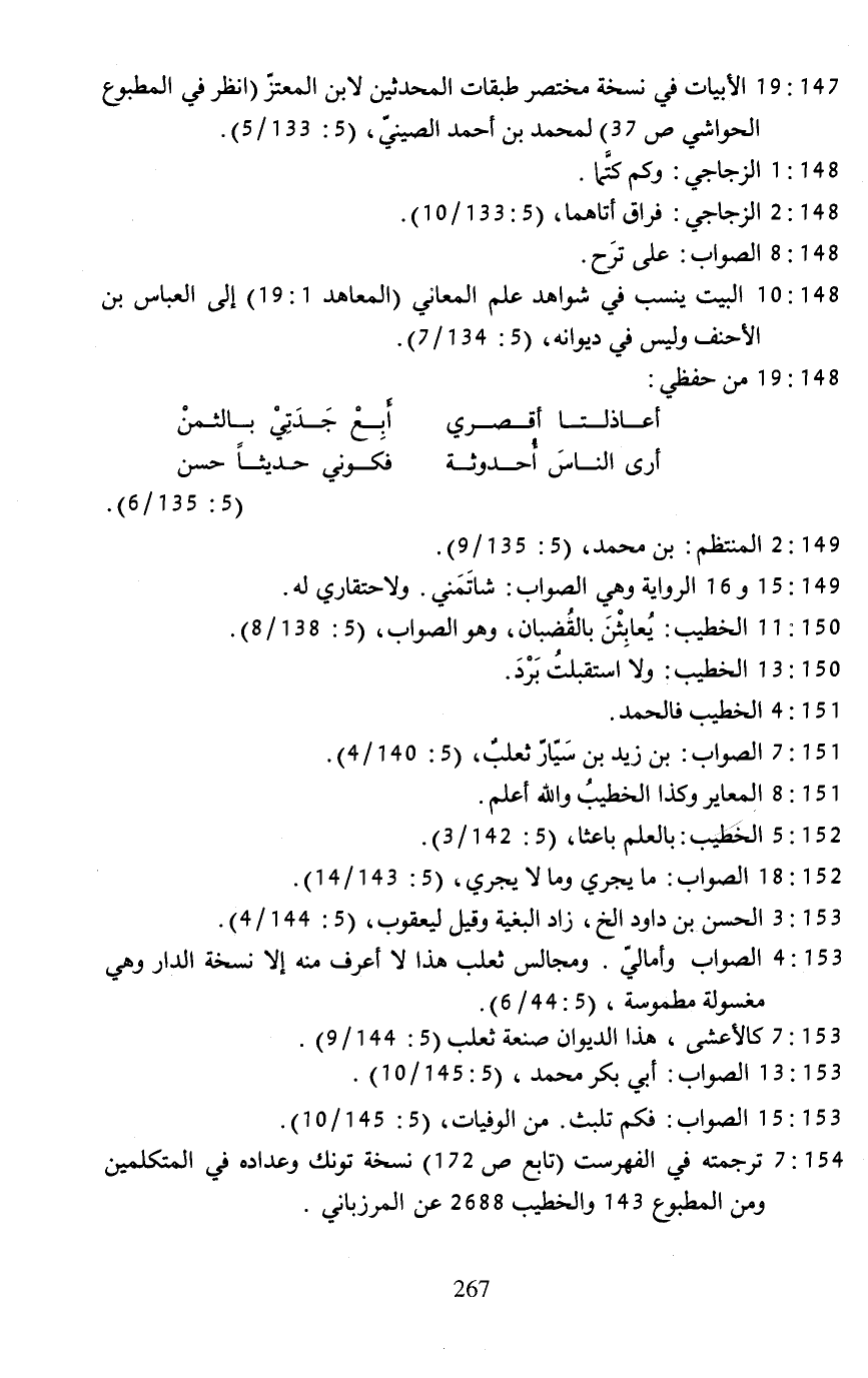 147: 19 ... الأبيات في نسخة مختصر طبقات المحدثين لابن المعتزّ (انظر في المطبوع الحواشي ص 37) لمحمد بن أحمد الصينيّ، (5: 133/ 5).