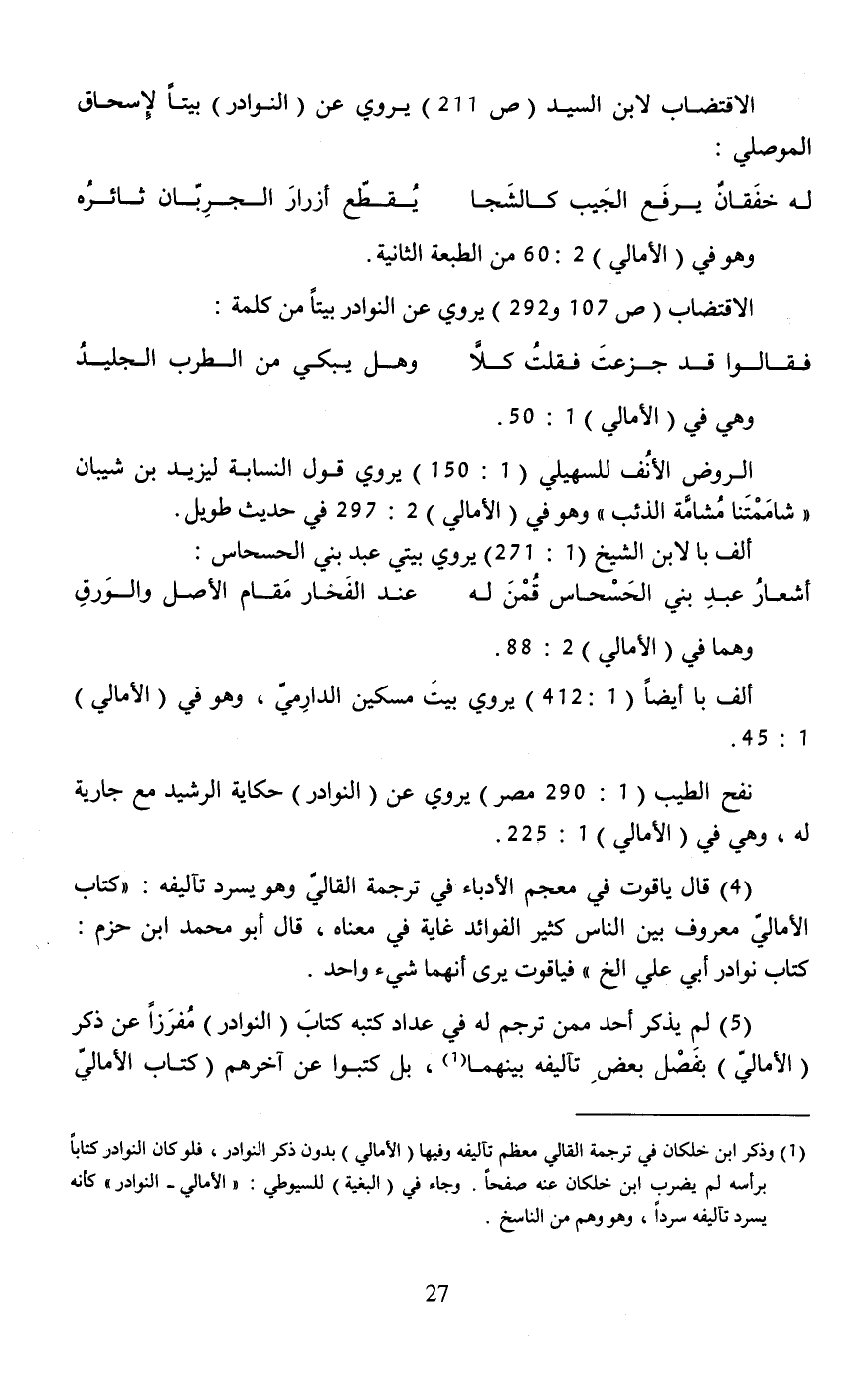 (¬1) وذكر ابن خلكان في ترجمة القالي معظم تآليفه وفيها (الأمالي) بدون ذكر النوادر، فلو كان النوادر كتابًا برأسه لم يضرب ابن خلكان عنه صفحًا. وجاء في (البغية) للسيوطي: "الأمالي- النوادر" كأنه يسرد تآليفه سردًا، وهو وهم من الناسخ.