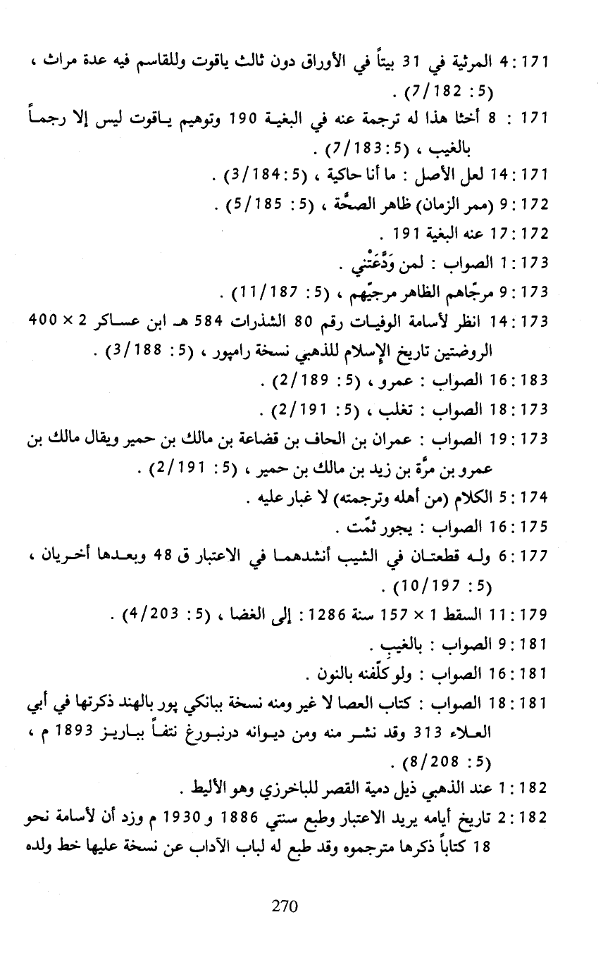 181: 18 ... الصواب: كتاب العصا لا غير ومنه نسخة ببانكي بور بالهند ذكرتها في أبي العلاء 313 ... وقد نشر منه ومن ديوانه درنبورغ نتفًا بباريز 1893 م، (5: 208/ 8).