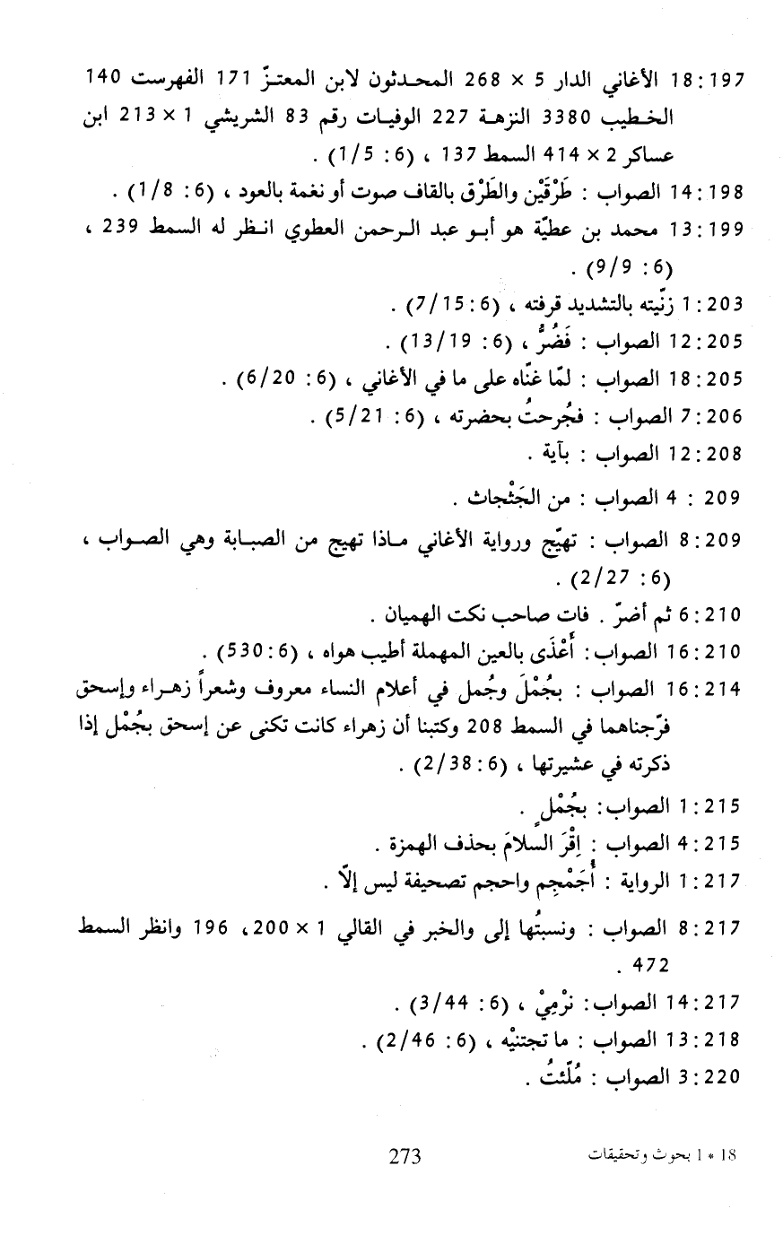 197: 18 ... الأغاني الدار 5 × 268 المحدثون لابن المعتز 171 الفهرست 140 الخطيب 3380 النزهة 227 الوفيات رقم 83 الشريشي 1 × 213 ابن عساكر 2 × 414 السمط 137، (5: 5/ 1).