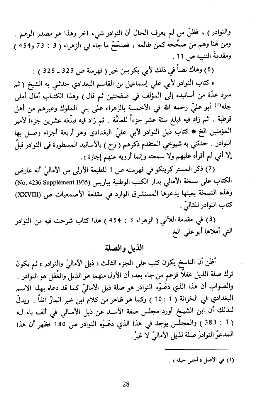 أظن أن الناسخ يكون كتب على الجزء الثالث "ذيل الأماليّ والنوادر" ثم يكون ترك صلة الذيل غفلًا فزعم من جاء بعده أن الأول منهما هو الذيل والغُفل هو النوادر. والصواب أن هذا الذي دعَوْه النوادر هو صلة ذيل الأمالي كما قد دعاه بهذا الاسم البغدادي في الخزانة (1: 15) وكما هو ظاهر من كلام ابن خير المارّ آنفًا. ويدلّ لذلك أن ابن الشيخ أورد مجلس صفة الأسد عن ذيل الأمالي في ألف باء له (1: 383) والمجلس يوجد في هذا الذي دعَوْه النوادر ص 180 فظهر أن هذا المدعوّ النوادرَ صلة لذيل الأمالي لا غيرُ.