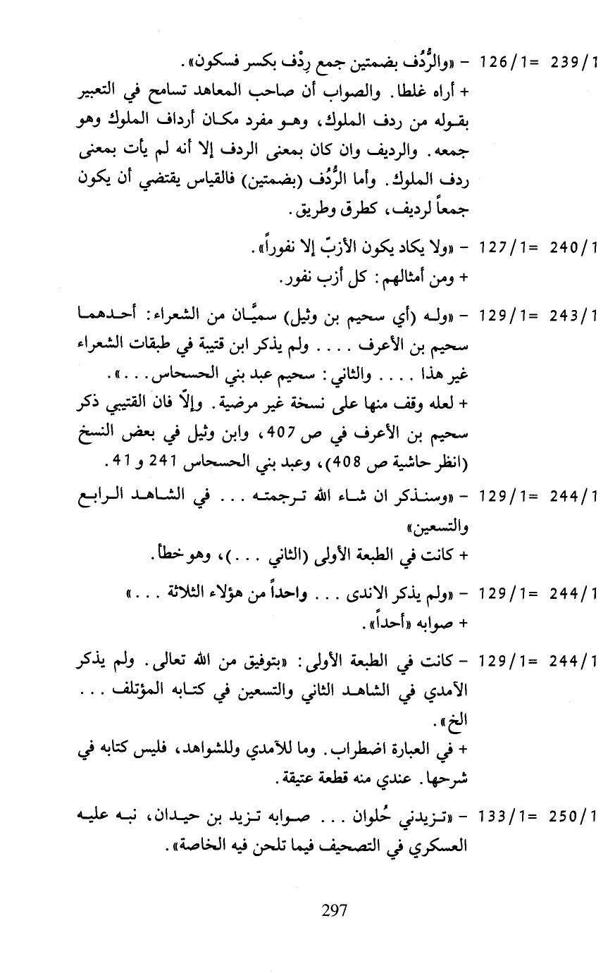 1/ 250 = 1/ 133 - "تزيدني حُلوان ... صوابه تزيد بن حيدان، نبه عليه العسكري في التصحيف فيما تلحن فيه الخاصة".