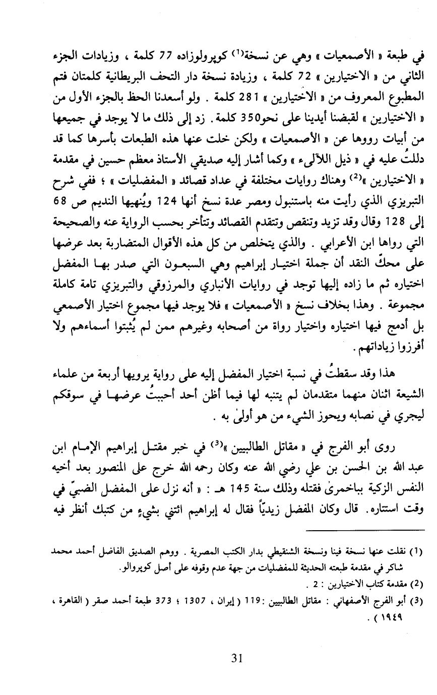 في طبعة "الأصمعيات" وهي عن نسخة (¬1) كوبرولوزاده 77 كلمة، وزيادات الجزء الثاني من "الاختيارين" 72 كلمة، وزيادة نسخة دار التحف البريطانية كلمتان فتم المطبوع المعروف من "الاختيارين"281 كلمة. ولو أسعدنا الحظ بالجزء الأول من "الاختيارين" لقبضنا أيدينا على نحوه 350 كلمة. زد إلى ذلك ما لا يوجد في جميعها من أبيات رووها عن "الأصمعيات" ولكن خلت عنها هذه الطبعات بأسرها كما قد دللتُ عليه في "ذيل اللآلئ" وكما أشار إليه صديقي الأستاذ معظم حسين في مقدمة "الاختيارين" (¬2) وهناك روايات مختلفة في عداد قصائد "المفضليات"؛ ففي شرح التبريزي الذي رأيت منه باستنبول ومصر عدة نسخ أنها 124 ويُنهيها النديم ص 68 إلى 128 وقال وقد تزيد وتنقص وتتقدم القصائد وتتأخر بحسب الرواية عنه والصحيحة التي رواها ابن الأعرابي. والذي يتخلص من كل هذه الأقوال المتضاربة بعد عرضها على محكّ النقد أن جملة اختيار إبراهيم وهي السبعون التي صدر بها المفضل اختياره ثم ما زاده إليها توجد في روايات الأنباري والمرزوقي والتبريزي تامة كاملة مجموعة. وهذا بخلاف نسخ "الأصمعيات" فلا يوجد فيها مجموع اختيار الأصمعي بل أدمج فيها اختياره واختيار رواة من أصحابه وغيرهم ممن لم يُثبتوا أسماءهم ولا أفرزوا زياداتهم.