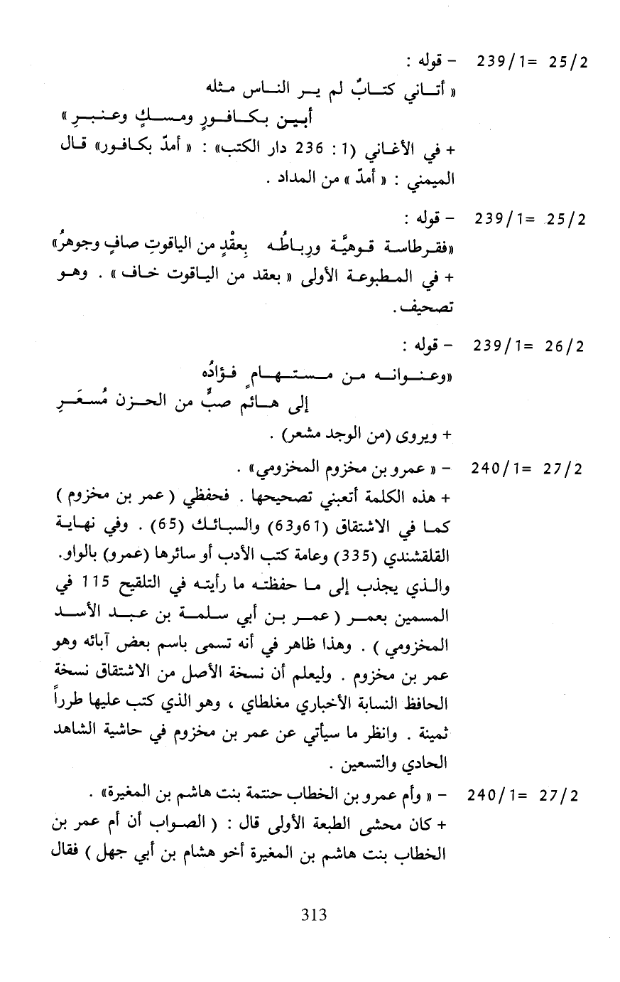 + هذه الكلمة أتعبني تصحيحها. فحفظي (عمر بن مخزوم) كما في الاشتقاق (61 أو 63) والسبائك (65). وفي نهاية القلقشندي (335) وعامة كتب الأدب أو سائرها (عمرو) بالواو. والذي يجذب إلى ما حفظته ما رأيته في التلقيح 115 في المسمين بعمر (عمر بن أبي سلمة بن عبد الأسد المخزومي). وهذا ظاهر في أنَّه تسمى باسم بعض آبائه وهو عمر بن مخزوم. وليعلم أن نسخة الأصل من الاشتقاق نسخة الحافظ النسابة الأخباري مغلطاي، وهو الذي كتب عليها طررًا ثمينة. وانظر ما سيأتي عن عمر بن مخزوم في حاشية الشاهد الحادي والتسعين.