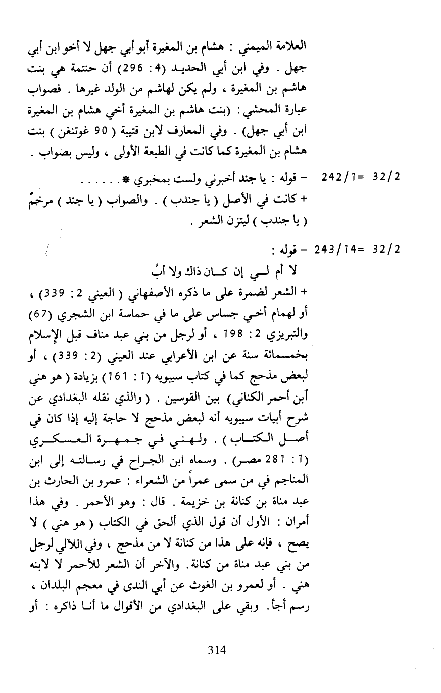 العلامة الميمني: هشام بن المغيرة أبو أبي جهل لا أخو ابن أبي جهل. وفي ابن أبي الحديد (4: 296) أن حنتمة هي بنت هاشم بن المغيرة، ولم يكن لهاشم من الولد غيرها. فصواب عبارة المحشي: (بنت هاشم بن المغيرة أخي هشام بن المغيرة بن أبي جهل). وفي المعارف لابن قتيبة (90 غوتنغن) بنت هشام بن المغيرة كما كانت في الطبعة الأولى، وليس بصواب.