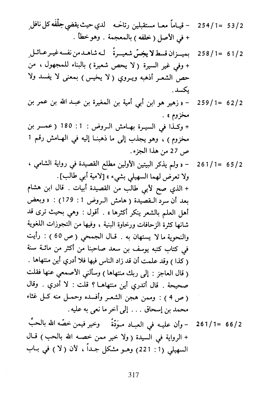 2/ 65 = 1/ 261 - "ولم يذكر البيتين الأولين مطلع القصيدة في رواية الشامي، ولا تعرض لهما السهيلي بشيء" [لامية أبي طالب].