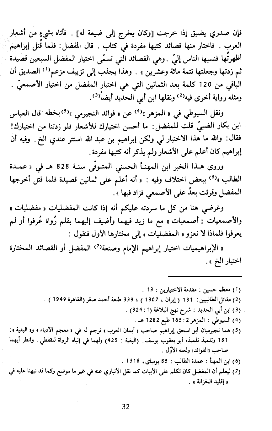 ونقل السيوطي في "المزهر" (¬4) عن "فوائد النجيرمي" (¬5) بخطه: قال العباس ابن بكار الضبيّ قلت للمفضل: ما أحسن اختيارك للأشعار فلو زدتنا من اختيارك! فقال: والله ما هذا الاختيار لي ولكن إبراهيم بن عبد الله استتر عندي الخ. وفيه أن إبراهيم كان أعلم على الأشعار ولم يذكر أنه كتبها مفردة.