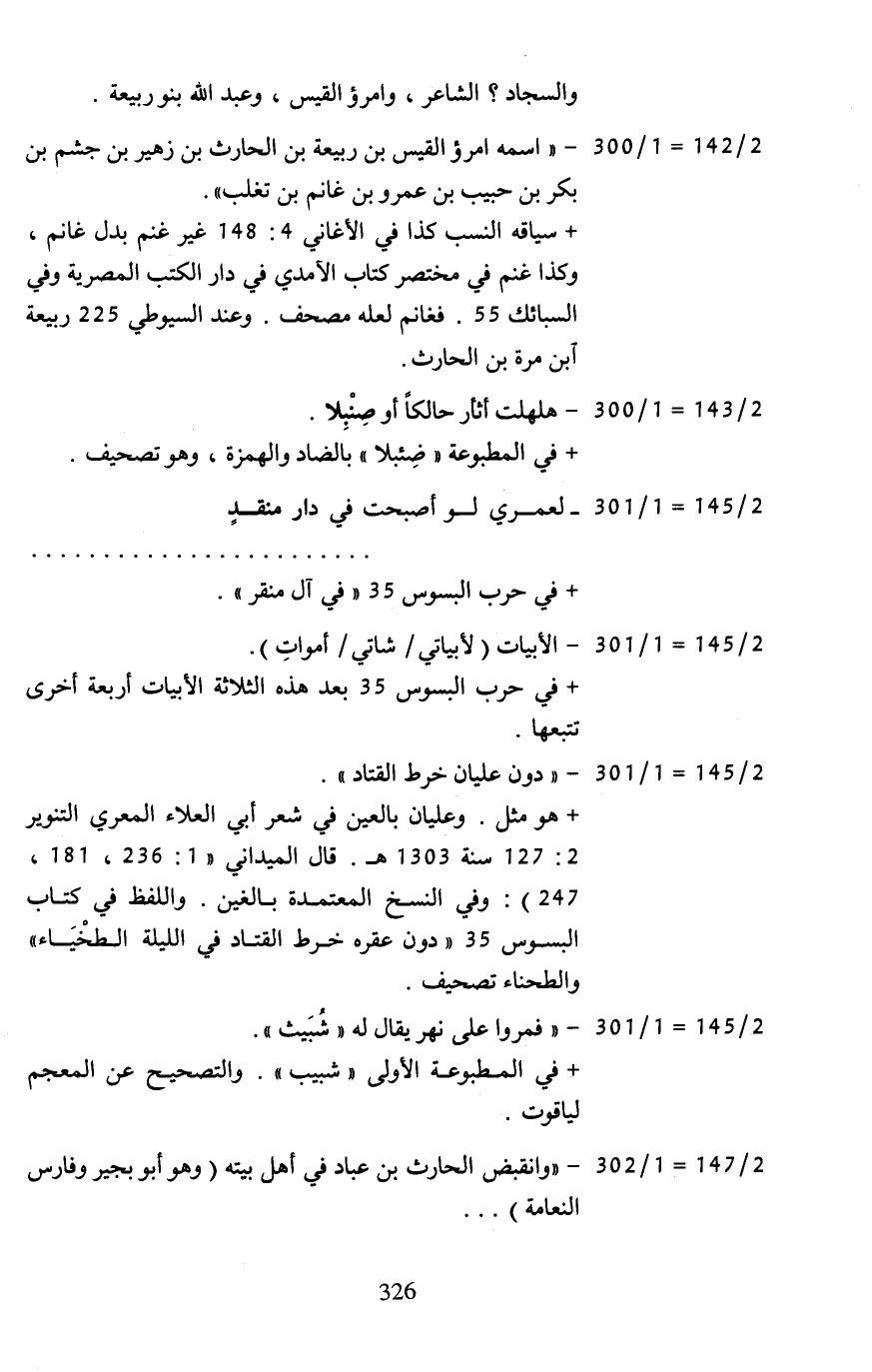 2/ 142 = 1/ 300 - "اسمه امرؤ القيس بن ربيعة بن الحارث بن زهير بن جشم بن بكر بن حبيب بن عمرو بن غانم بن تغلب".