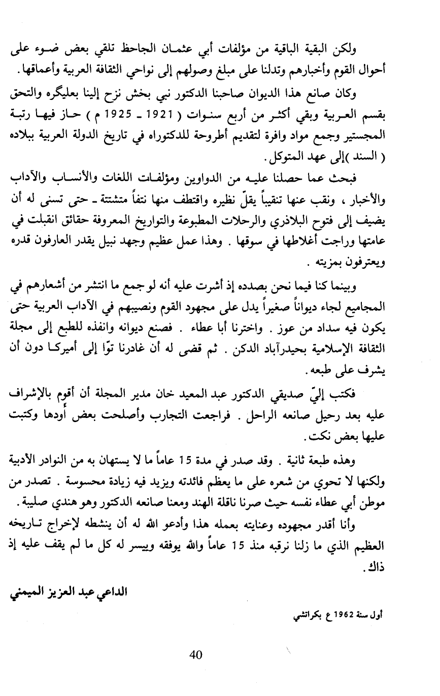 وبينما كنا فيما نحن بصدده إذ أشرت عليه أنه لو جمع ما انتشر من أشعارهم في المجاميع لجاء ديوانًا صغيرًا يدل على مجهود القوم ونصيبهم في الأداب العربية حتى يكون فيه سداد من عوز. واخترنا أبا عطاء. فصنع ديوانه وأنفذه للطبع إلى مجلة الثقافة الإسلامية بحيدرآباد الدكن. ثم قضى له أن غادرنا توّا إلى أميركا دون أن يشرف على طبعه.