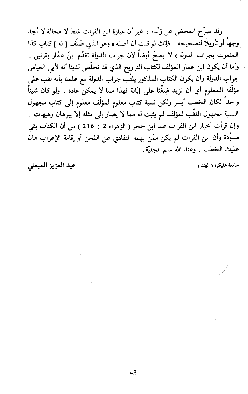 وقد صرّح المحض عن زبْده، غير أن عبارة ابن الفرات غلط لا محالة لا أجد وجهًا أو تأويلًا لتصحيحه. فإنك لو قلت أن أصله "وهو الذي صَنّف [له] كتاب كذا المنعوت بجراب الدولة" لا يصحّ أيضًا لأن جراب الدولة تقدّم ابنَ عمّار بقرنين. وأما أن يكون ابن عمار المؤلف لكتاب الترويح الذي قد تخلّص لدينا أنه لأبي العباس جراب الدولة وأن يكون الكتاب المذكور يلقّب جراب الدولة مع علمنا بأنه لقب على مؤلفه المعلوم أي أن تزيد ضِغْثا على إبّالة فهذا مما لا يمكن عادة. ولو كان شيئًا واحدًا لكان الخطب أيسر ولكن نسبة كتاب معلوم لمؤلف معلوم إلى كتاب مجهول النسبة مجهوك اللقب لمؤلف لم يثبت له مما لا يصار إلى مثله إلا ببرهان وهيهات. وإن قرأت أخبار ابن الفرات عند ابن حجر (الزهراء 2: 216) من أن الكتاب بقي مسوَّدة وأن ابن الفرات لم يكن ممّن يهمه التفادي عن اللحن أو إقامة الإعراب هان عليك الخطب. وعند الله علم الجلية.