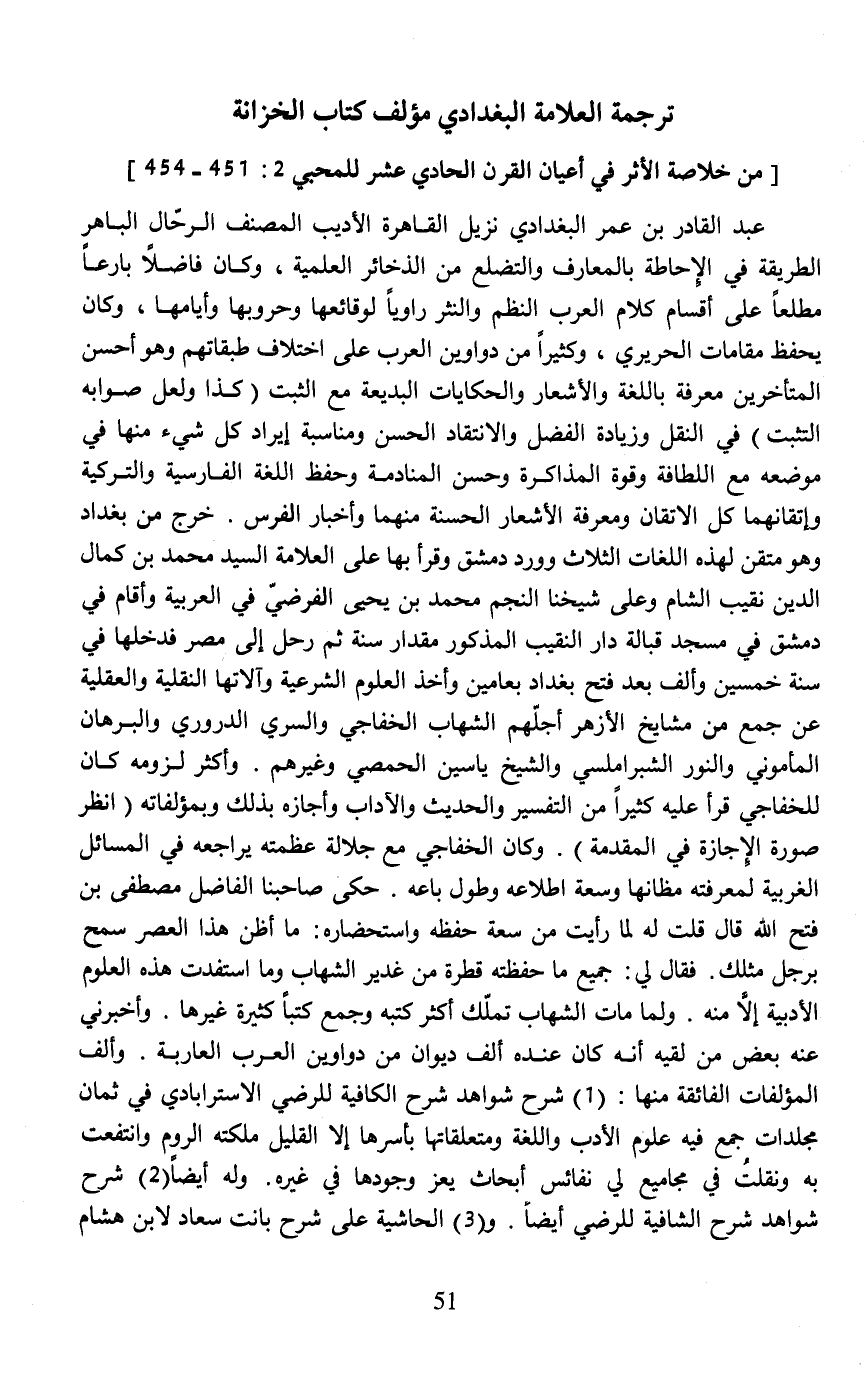 ترجمة العلامة البغدادي مؤلف كتاب الخزانة [من خلاصة الأثر في أعيان القرن الحادي عشر للمحيي 2: 451 - 454]