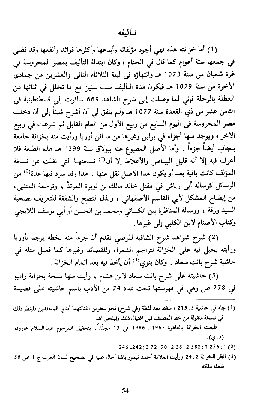 (2) شرح شواهد شرح الشافية للرضي تقدم أن جزءًا منه بخطه يوجد بأوربا ورأيته يحيل فيه على الخزانة لتراجم الشعراء وللقصائد وغيرها كما فعل مثله في حاشية شرح بانت سعاد. وكان ينوي (¬3) أن يأخذ فيه بعد إتمام الخزانة.