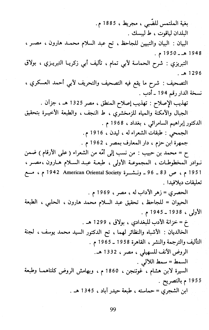 ح = محمد بن حبيب: من نسب إلى أمِّه من الشعراء (على الأرقام) ضمن نوادر المخطوطات، المجموعة الأولى، طبعة عبد السلام هارون، مصر، 1951 م، ص 83 - 96 - ونشرة American Oriental Society 1942 م، مع تعليقات ديلافيدا.