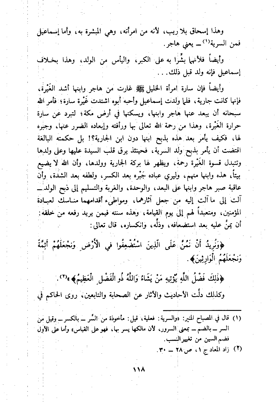 وأيضا فإن سارة امرأة الخليل صلّى الله عليه وسلّم غارت من هاجر وابنها أشد الغيرة، فإنها كانت جارية، فلما ولدت إسماعيل وأحبه أبوه اشتدت غيرة سارة؛ فأمر الله سبحانه أن يبعد عنها هاجر وابنها، ويسكنها في أرض مكة؛ لتبرد عن سارة حرارة الغيرة، وهذا من رحمة الله تعالى بها ورأفته وإبعاده الضرر عنها، وجبره لها، فكيف يأمر بعد هذه بذبح ابنها دون ابن الجارية؟! بل حكمته البالغة اقتضت أن يأمر بذبح ولد السرية، فحينئذ يرق قلب السيدة عليها وعلى ولدها وتتبدل قسوة الغيرة رحمة، ويظهر لها بركة الجارية وولدها، وأن الله لا يضيع بيتا، هذه وابنها منهم، وليري عباده جبره بعد الكسر، ولطفه بعد الشدة، وأن عاقبة صبر هاجر وابنها على البعد، والواحدة، والغربة والتسليم إلى ذبح الولد- الت إلى ما الت إليه من جعل اثارهما، ومواطىء أقدامهما مناسك لعبادة المؤمنين، ومتعبدا لهم إلى يوم القيامة، وهذه سنته فيمن يريد رفعه من خلقه: