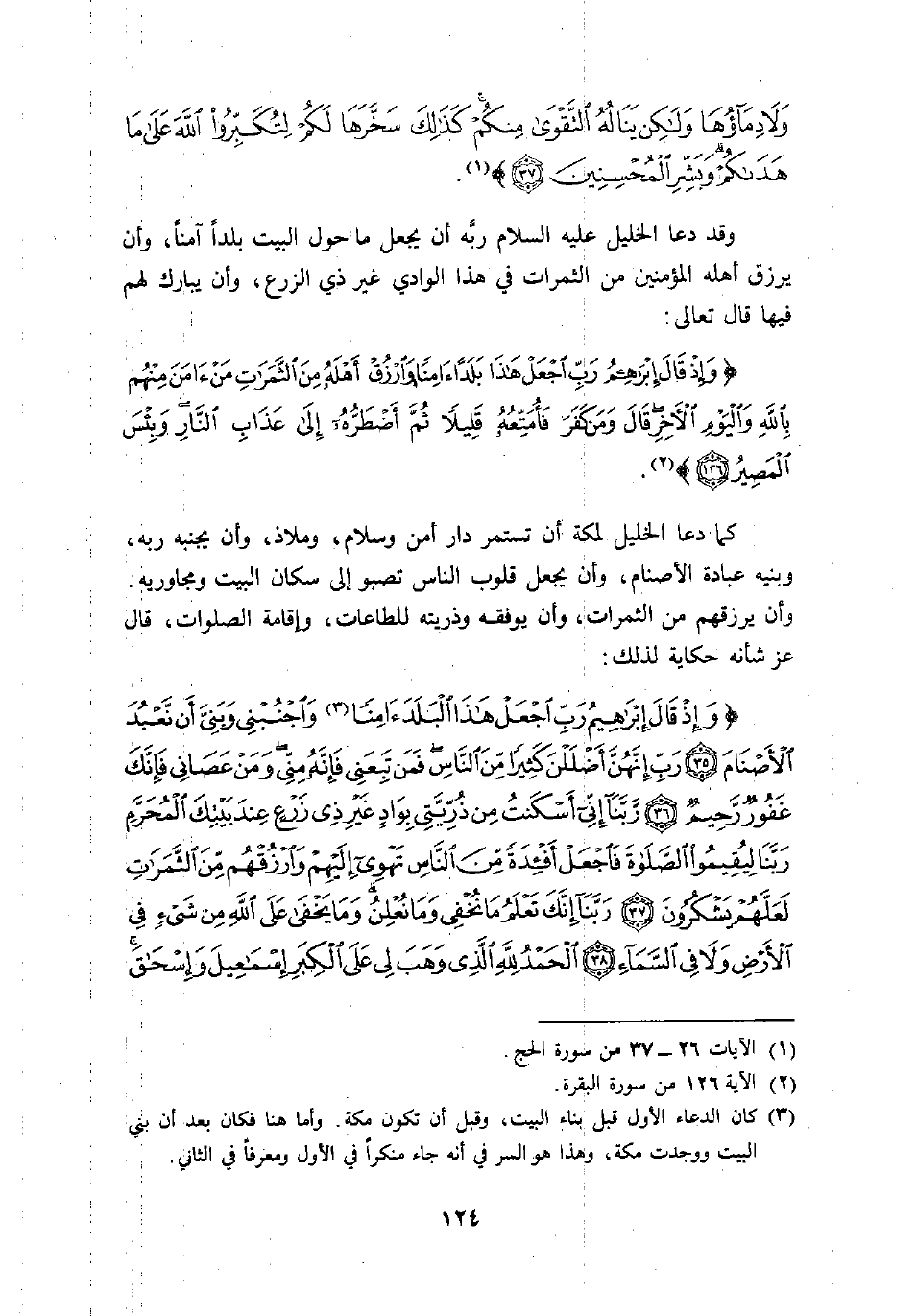 وَإِذْ قالَ إِبْراهِيمُ رَبِّ اجْعَلْ هَذَا الْبَلَدَ آمِناً وَاجْنُبْنِي وَبَنِيَّ أَنْ نَعْبُدَ الْأَصْنامَ (35) رَبِّ إِنَّهُنَّ أَضْلَلْنَ كَثِيراً مِنَ النَّاسِ فَمَنْ تَبِعَنِي فَإِنَّهُ مِنِّي وَمَنْ عَصانِي فَإِنَّكَ غَفُورٌ رَحِيمٌ (36) رَبَّنا إِنِّي أَسْكَنْتُ مِنْ ذُرِّيَّتِي بِوادٍ غَيْرِ ذِي زَرْعٍ عِنْدَ بَيْتِكَ الْمُحَرَّمِ رَبَّنا لِيُقِيمُوا الصَّلاةَ فَاجْعَلْ أَفْئِدَةً مِنَ النَّاسِ تَهْوِي إِلَيْهِمْ وَارْزُقْهُمْ مِنَ الثَّمَراتِ لَعَلَّهُمْ يَشْكُرُونَ (37) رَبَّنا إِنَّكَ تَعْلَمُ ما نُخْفِي وَما نُعْلِنُ وَما يَخْفى عَلَى اللَّهِ مِنْ شَيْءٍ فِي الْأَرْضِ وَلا فِي السَّماءِ (38) الْحَمْدُ لِلَّهِ الَّذِي وَهَبَ لِي عَلَى الْكِبَرِ إِسْماعِيلَ وَإِسْحاقَ «3»