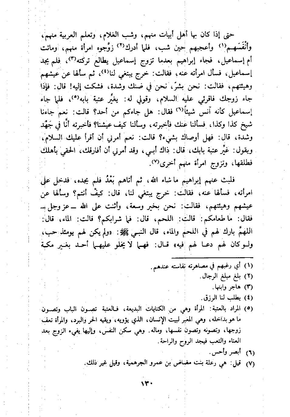 فلبث عنهم إبراهيم ما شاء الله، ثم أتاهم بعد فلم يجده، فدخل على امرأته، فسألها عنه، فقالت: خرج يبتغي لنا، قال: كيف أنتم؟ وسألها عن عيشهم وهيئتهم، فقالت: نحن بخير وسعة، وأثنت على الله- عز وجل- فقال: ما طعامكم: قالت: اللحم، قال: فما شرابكم؟ قالت: الماء، قال: