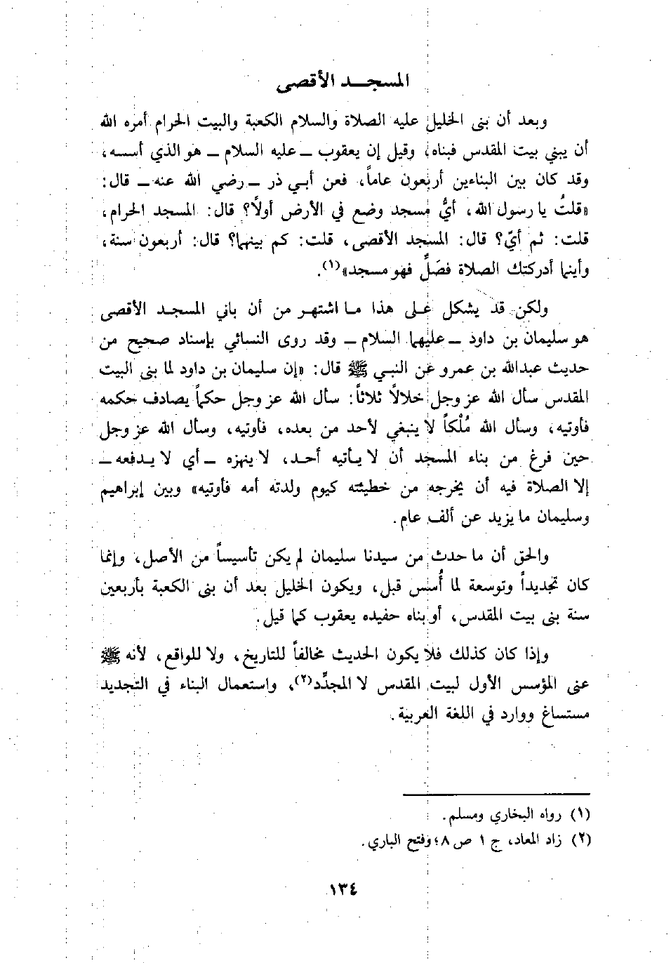 «قلت يا رسول الله، أيّ مسجد وضع في الأرض أولا؟ قال: المسجد الحرام، قلت: ثم أيّ؟ قال: المسجد الأقصى، قلت: كم بينهما؟ قال: أربعون سنة، وأينما أدركتك الصلاة فصلّ فهو مسجد» «1» .