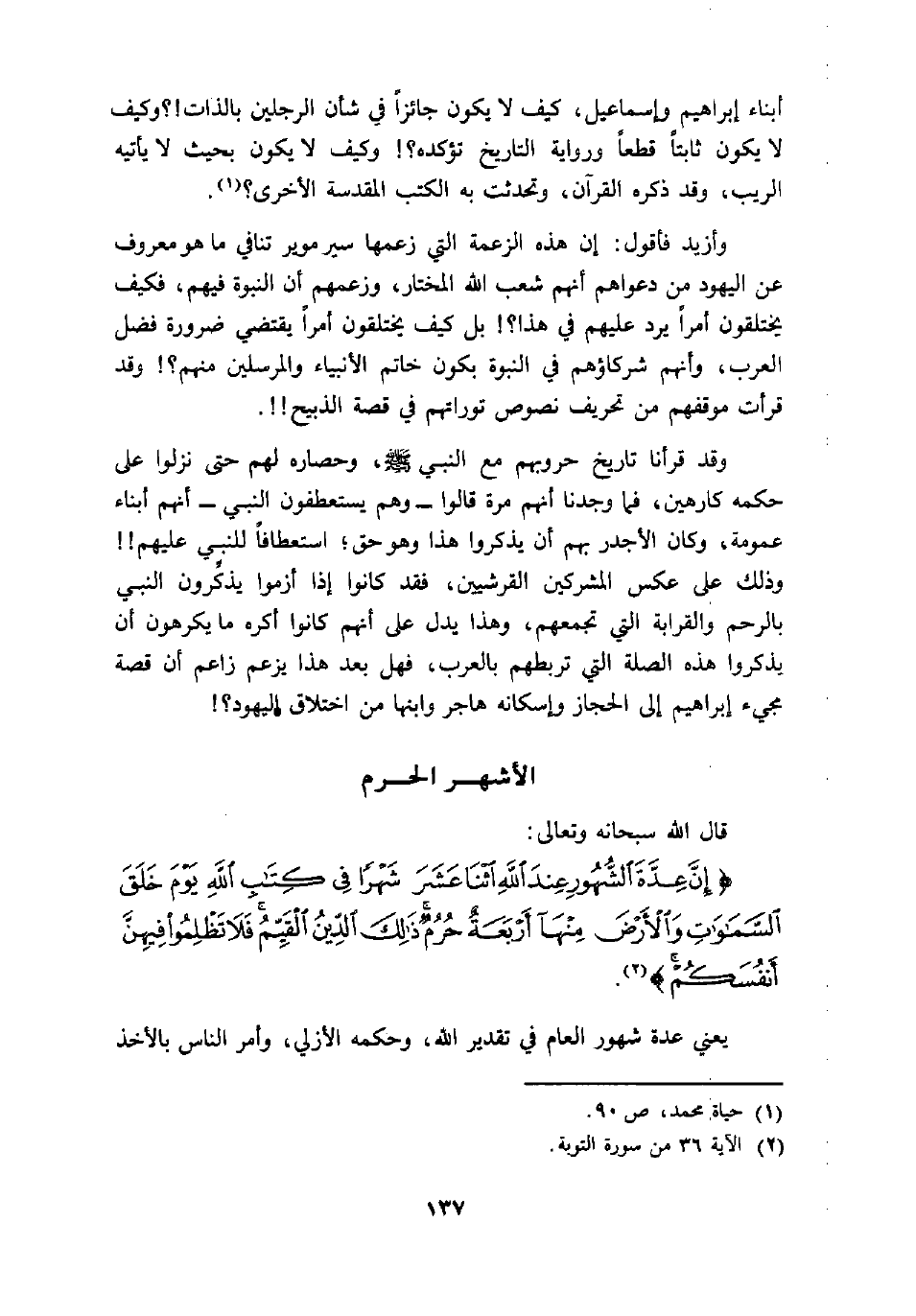 أبناء إبراهيم وإسماعيل، كيف لا يكون جائزا في شأن الرجلين بالذات!؟ وكيف لا يكون ثابتا قطعا ورواية التاريخ تؤكده؟! وكيف لا يكون بحيث لا يأتيه الريب، وقد ذكره القران، وتحدثت به الكتاب المقدسة الاخرى؟ «1» .