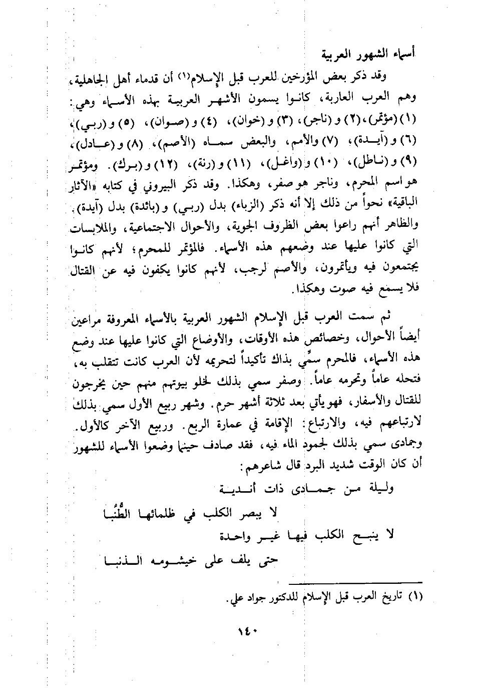وقد ذكر بعض المؤرخين للعرب قبل الإسلام «1» أن قدماء أهل الجاهلية، وهم العرب العاربة، كانوا يسمون الأشهر العربية بهذه الأسماء وهي:
