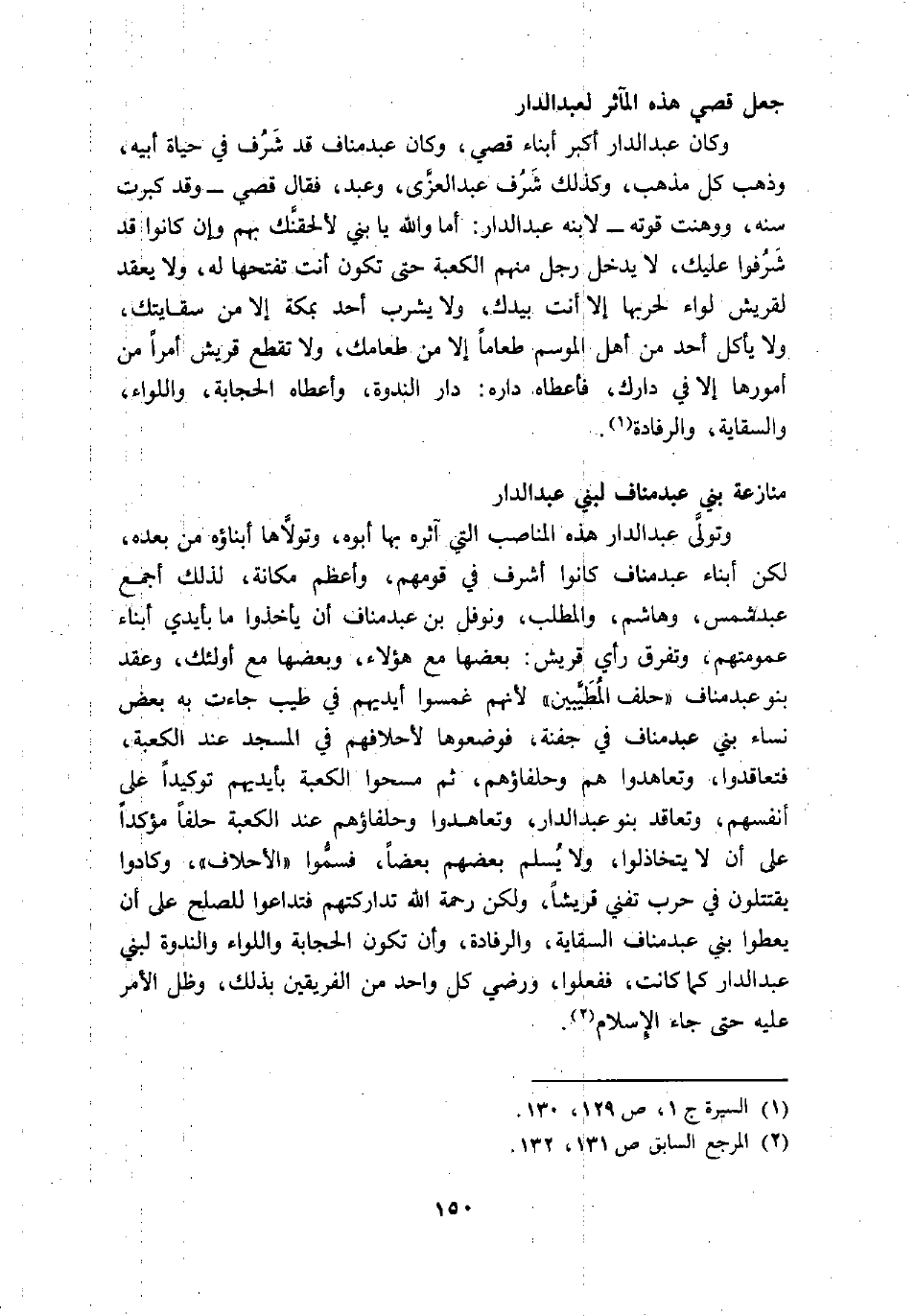 وتولّى عبد الدار هذه المناصب التي اثره بها أبوه، وتولّاها أبناؤه من بعده، لكن أبناء عبد مناف كانوا أشرف في قومهم، وأعظم مكانة، لذلك أجمع عبد شمس، وهاشم، والمطلب، ونوفل بن عبد مناف أن يأخذوا ما بأيدي أبناء عمومتهم، وتفرق رأي قريش: بعضها مع هؤلاء، وبعضها مع أولئك، وعقد بنو عبد مناف «حلف المطيّبين» لأنهم غمسوا أيديهم في طيب جاءت به بعض نساء بني عبد مناف في جفنة، فوضعوها لأحلافهم في المسجد عند الكعبة، فتعاقدوا، وتعاهدوا هم وحلفاؤهم، ثم مسحوا الكعبة بأيديهم توكيدا على أنفسهم، وتعاقد بنو عبد الدار، وتعاهدوا وحلفاؤهم عند الكعبة حلفا مؤكدا على ألايتخاذلوا، ولا يسلم بعضهم بعضا، فسمّوا «الأحلاف» ، وكادوا يقتتلون في حرب تفني قريشا، ولكن رحمة الله تداركتهم فتداعوا للصلح على أن يعطوا بني عبد مناف السقاية، والرفادة، وأن تكون الحجابة واللواء والندوة لبني عبد الدار كما كانت، ففعلوا، ورضي كل واحد من الفريقين بذلك، وظل الأمر عليه حتى جاء الإسلام «2» .