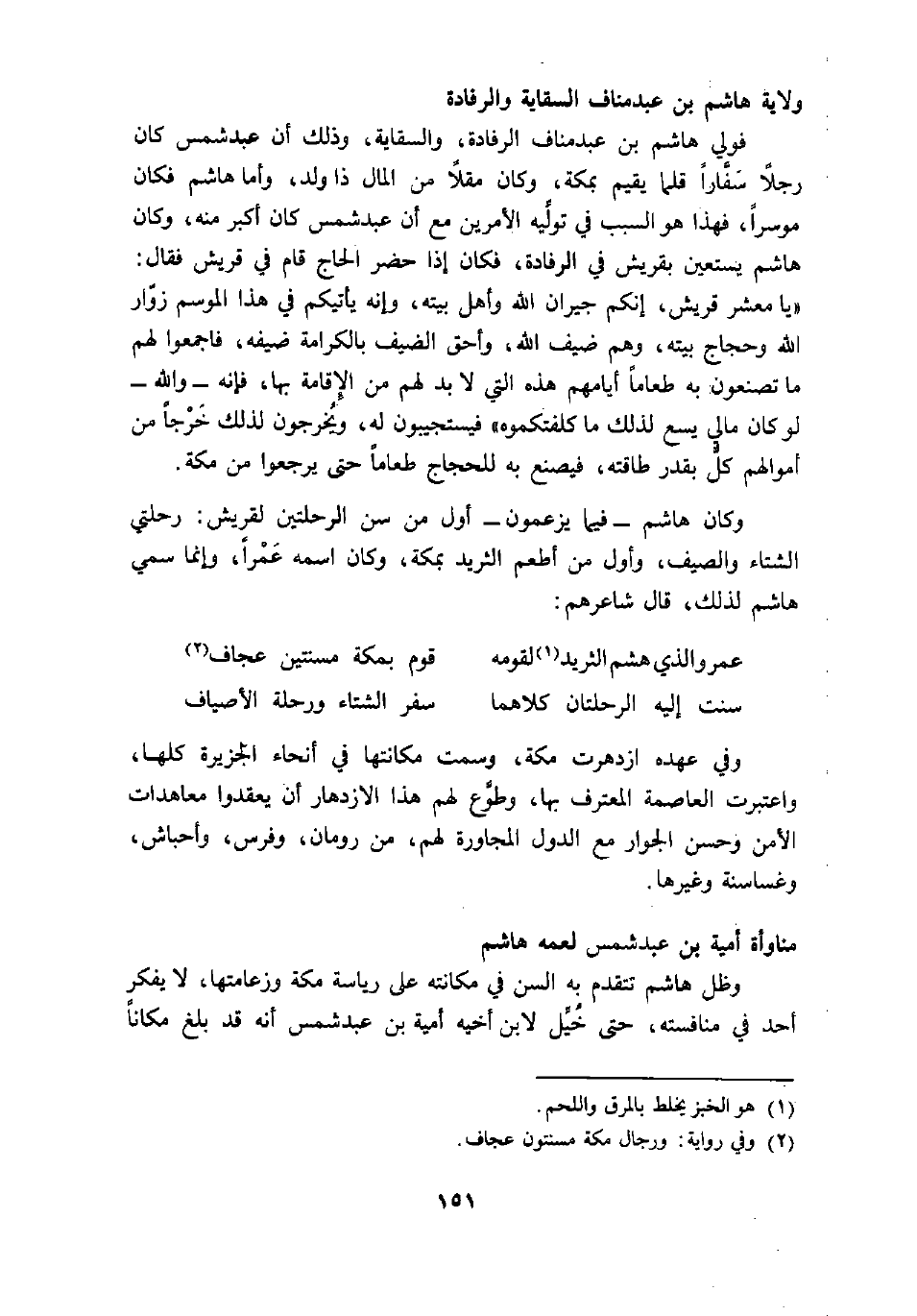 وكان هاشم- فيما يزعمون- أول من سن الرحلتين لقريش: رحلتي الشتاء والصيف، وأول من أطعم الثريد بمكة، وكان اسمه عمرا، وإنما سمي هاشم لذلك، قال شاعرهم: