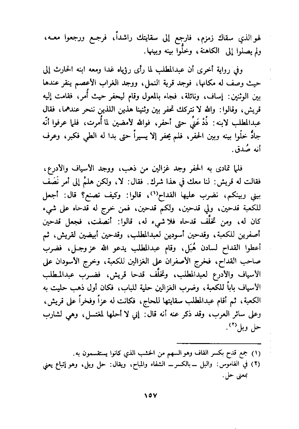 فلما تمادى به الحفر وجد غزالين من ذهب، ووجد الأسياف والأدرع، فقالت له قريش: لنا معك في هذا شرك. فقال: لا، ولكن هلمّ إلى أمر نصف بيني وبينكم، نضرب عليها القداح «1» ، قالوا: وكيف تصنع؟ قال: أجعل للكعبة قدحين، ولي قدحين، ولكم قدحين، فمن خرج له قدحاه على شيء كان له، ومن تخلّف قدحاه فلا شيء له، قالوا: أنصفت، فجعل قدحين أصفرين للكعبة، وقدحين أسودين لعبد المطلب، وقدحين أبيضين لقريش، ثم أعطوا القداح لسادن هبل، وقام عبد المطلب يدعو الله عز وجل، فضرب صاحب القداح، فخرج الأصفران على الغزالين للكعبة، وخرج الأسودان على الأسياف والأدرع لعبد المطلب، وتخلّف قدحا قريش، فضرب عبد المطلب الأسياف بابا للكعبة، وضرب الغزالين حلية للباب، فكان أول ذهب حليت به الكعبة، ثم أقام عبد المطلب سقايتها للحاج، فكانت له عزا وفخرا على قريش، وعلى سائر العرب، وقد ذكر عنه أنه قال: إني لا أحلها لمغتسل، وهي لشارب حل وبل «2» .