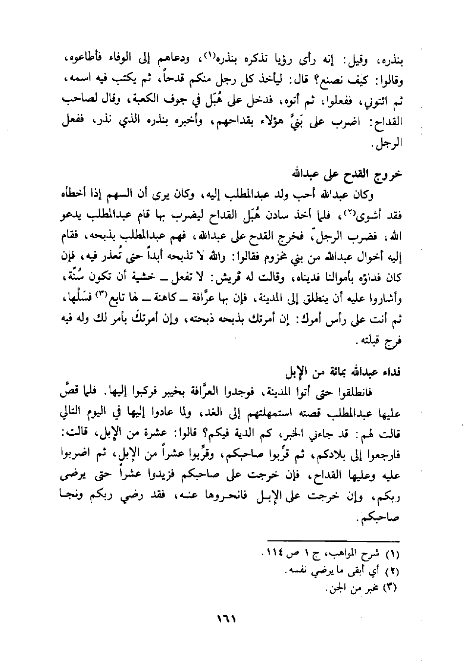وكان عبد الله أحب ولد عبد المطلب إليه، وكان يرى أن السهم إذا أخطأه فقد أشوى «2» ، فلما أخذ سادن هبل القداح ليضرب بها قام عبد المطلب يدعو الله، فضرب الرجل، فخرج القدح على عبد الله، فهم عبد المطلب بذبحه، فقام إليه أخوال عبد الله من بني مخزوم فقالوا: والله لا تذبحه أبدا حتى تعذر فيه، فإن كان فداؤه بأموالنا فديناه، وقالت له قريش: لا تفعل- خشية أن تكون سنّة، وأشاروا عليه أن ينطلق إلى المدينة، فإن بها عرّافة- كاهنة- لها تابع «3» فسلها، ثم أنت على رأس أمرك: إن أمرتك بذبحه ذبحته، وإن أمرتك بأمر لك وله فيه فرج قبلته.