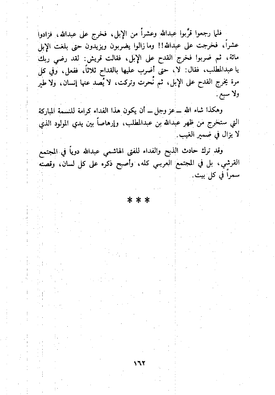 فلما رجعوا قرّبوا عبد الله وعشرا من الإبل، فخرج على عبد الله، فزادوا عشرا، فخرجت على عبد الله!! وما زالوا يضربون ويزيدون حتى بلغت الإبل مائة، ثم ضربوا فخرج القدح على الإبل، فقالت قريش: لقد رضي ربك يا عبد المطلب، فقال: لا، حتى أضرب عليها بالقداح ثلاثا، ففعل، وفي كل مرة يخرج القدح على الإبل، ثم نحرت وتركت، لا يصد عنها إنسان، ولا طير ولا سبع.