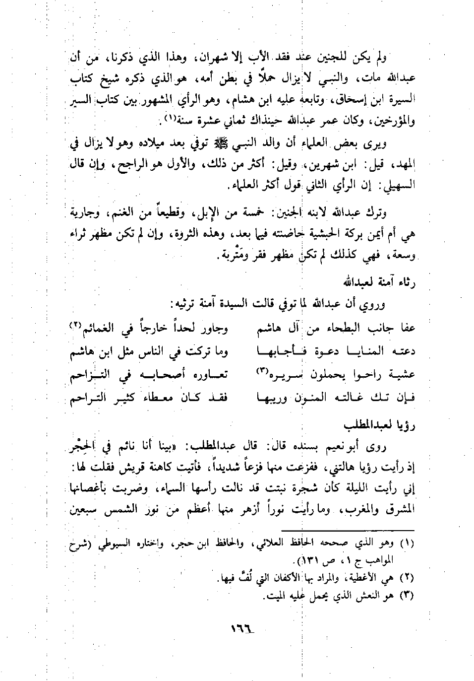 ولم يكن للجنين عند فقد الأب إلا شهران، وهذا الذي ذكرنا، من أن عبد الله مات، والنبي لا يزال حملا في بطن أمه، هو الذي ذكره شيخ كتاب السيرة ابن إسحاق، وتابعه عليه ابن هشام، وهو الرأي المشهور بين كتاب السير والمؤرخين، وكان عمر عبد الله حينذاك ثماني عشرة سنة «1» .