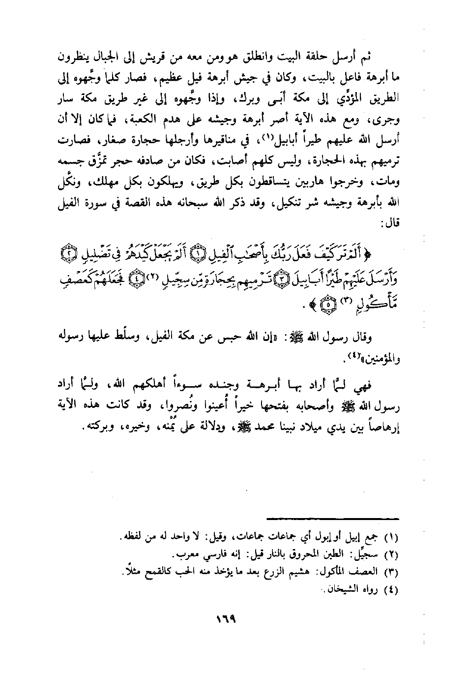أَلَمْ تَرَ كَيْفَ فَعَلَ رَبُّكَ بِأَصْحابِ الْفِيلِ (1) أَلَمْ يَجْعَلْ كَيْدَهُمْ فِي تَضْلِيلٍ (2) وَأَرْسَلَ عَلَيْهِمْ طَيْراً أَبابِيلَ (3) تَرْمِيهِمْ بِحِجارَةٍ مِنْ سِجِّيلٍ «2» (4) فَجَعَلَهُمْ كَعَصْفٍ مَأْكُولٍ «3» (5) .