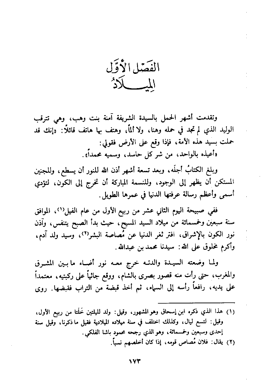 (1) هذا الذي ذكره ابن إسحاق وهو المشهور، وقيل: ولد لليلتين خلتا من ربيع الأول، وقيل: لتسع ليال، وكذلك اختلف في سنة ميلاده الميلادية فقيل ما ذكرنا، وقيل سنة إحدى وسبعين وخمسمائة، وهو الذي رجحه محمود باشا الفلكي.