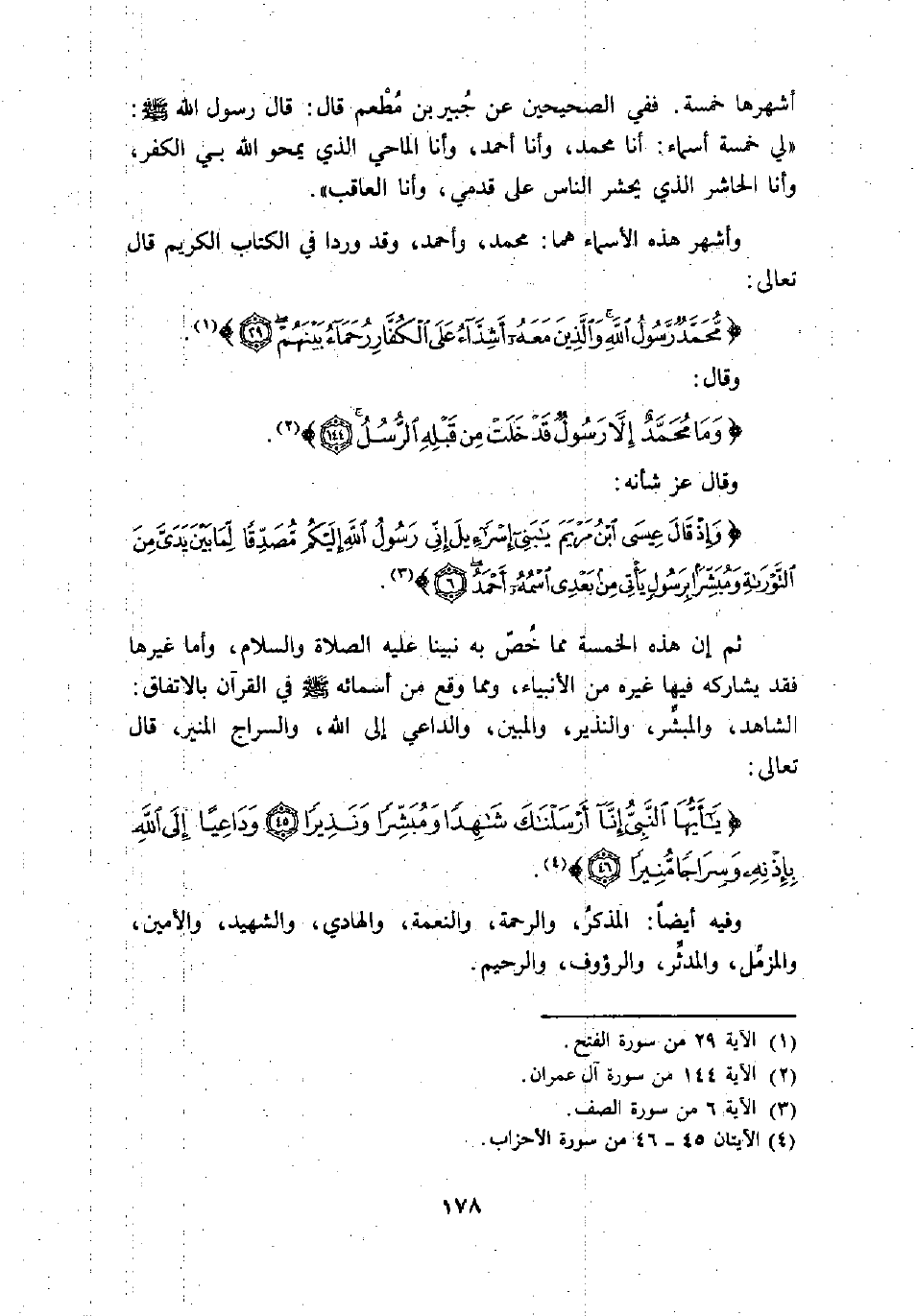 ثم إن هذه الخمسة مما خصّ به نبينا عليه الصلاة والسلام، وأما غيرها فقد يشاركه فيها غيره من الأنبياء، ومما وقع من أسمائه صلّى الله عليه وسلّم في القران بالاتفاق: