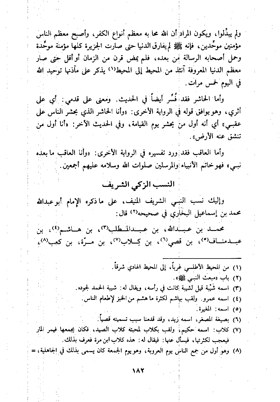 محمد بن عبد الله، بن عبد المطلب «3» ، بن هاشم «4» ، بن عبد مناف «5» ، بن قصي «6» ، بن كلاب «7» ، بن مرّة، بن كعب «8» ،