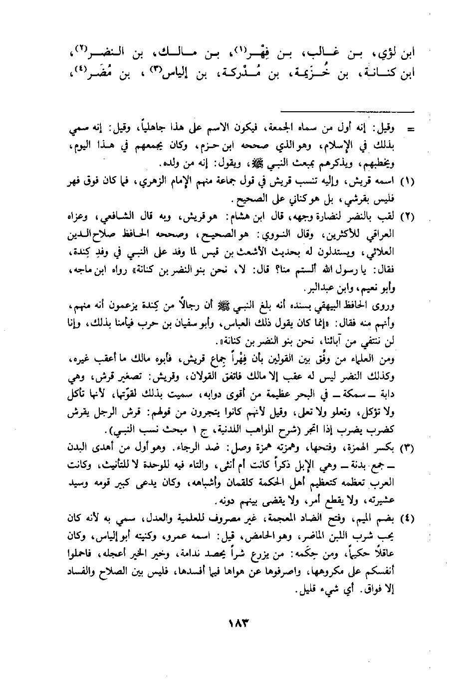 (1) اسمه قريش، وإليه تنسب قريش في قول جماعة منهم الإمام الزهري، فما كان فوق فهر فليس بقرشي، بل هو كناني على الصحيح.