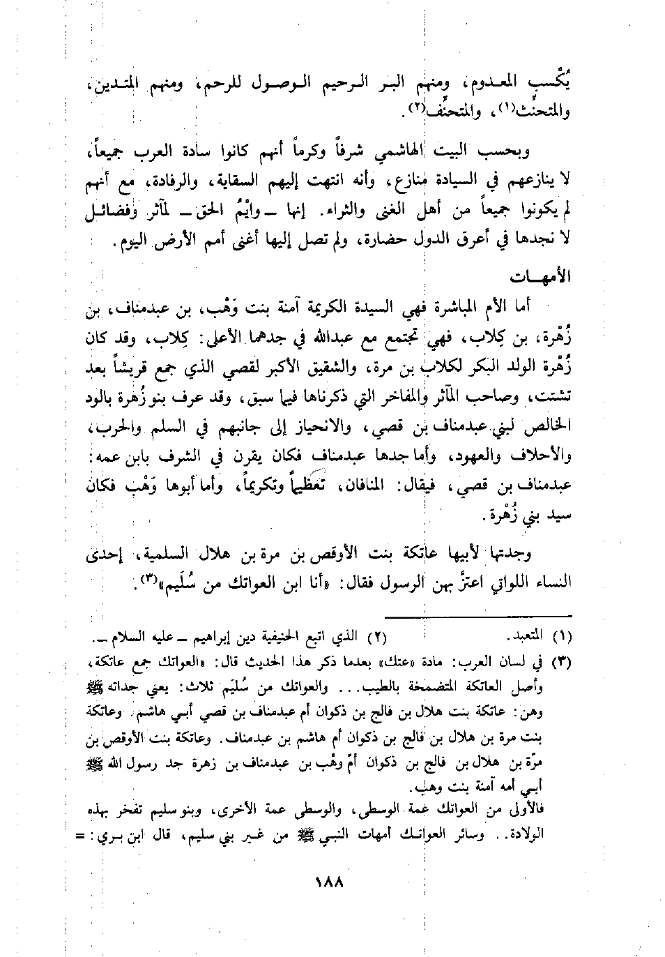 (3) في لسان العرب: مادة «عتك» بعد ما ذكر هذا الحديث قال: «العواتك جمع عاتكة، وأصل العاتكة المتضمخة بالطيب ... والعواتك من سليم ثلاث: يعني جداته صلّى الله عليه وسلّم وهن: عاتكة بنت هلال بن فالج بن ذكوان أم عبد مناف بن قصي أبي هاشم. وعاتكة بنت مرة بن هلال بن فالج بن ذكوان أم هاشم بن عبد مناف. وعاتكة بنت الأوقص بن مرّة بن هلال بن فالج بن ذكوان أمّ وهب بن عبد مناف بن زهرة جد رسول الله صلّى الله عليه وسلّم أبي أمه امنة بنت وهب. فالأولى من العواتك عمة الوسطى، والوسطى عمة الاخرى، وبنو سليم تفخر بهذه الولادة.. وسائر العواتك أمهات النبي صلّى الله عليه وسلّم من غير بني سليم، قال ابن بري: