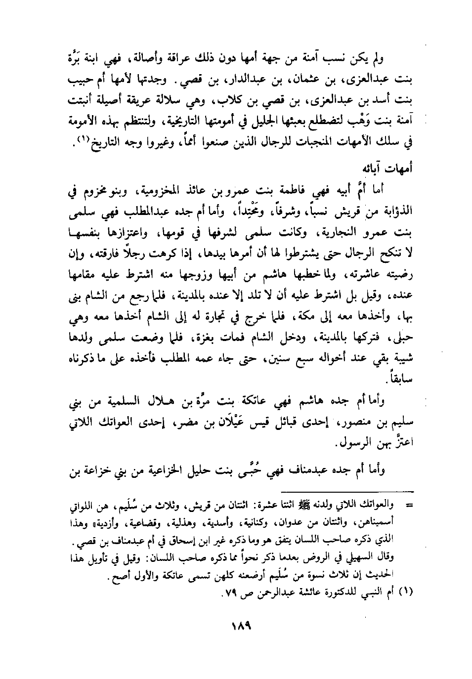 - والعواتك اللاتي ولدنه صلّى الله عليه وسلّم اثنتا عشرة: اثنتان من قريش، وثلاث من سليم، هن اللواتي أسميناهن، واثنتان من عدوان، وكنانية، وأسدية، وهذلية، وقضاعية، وأزدية» وهذا الذي ذكره صاحب اللسان يتفق هو وما ذكره غير ابن إسحاق في أم عبد مناف بن قصي. وقال السهيلي في الروض بعد ما ذكر نحوا مما ذكره صاحب اللسان: وقيل في تأويل هذا الحديث إن ثلاث نسوة من سليم أرضعنه كلهن تسمى عاتكة والأول أصح.