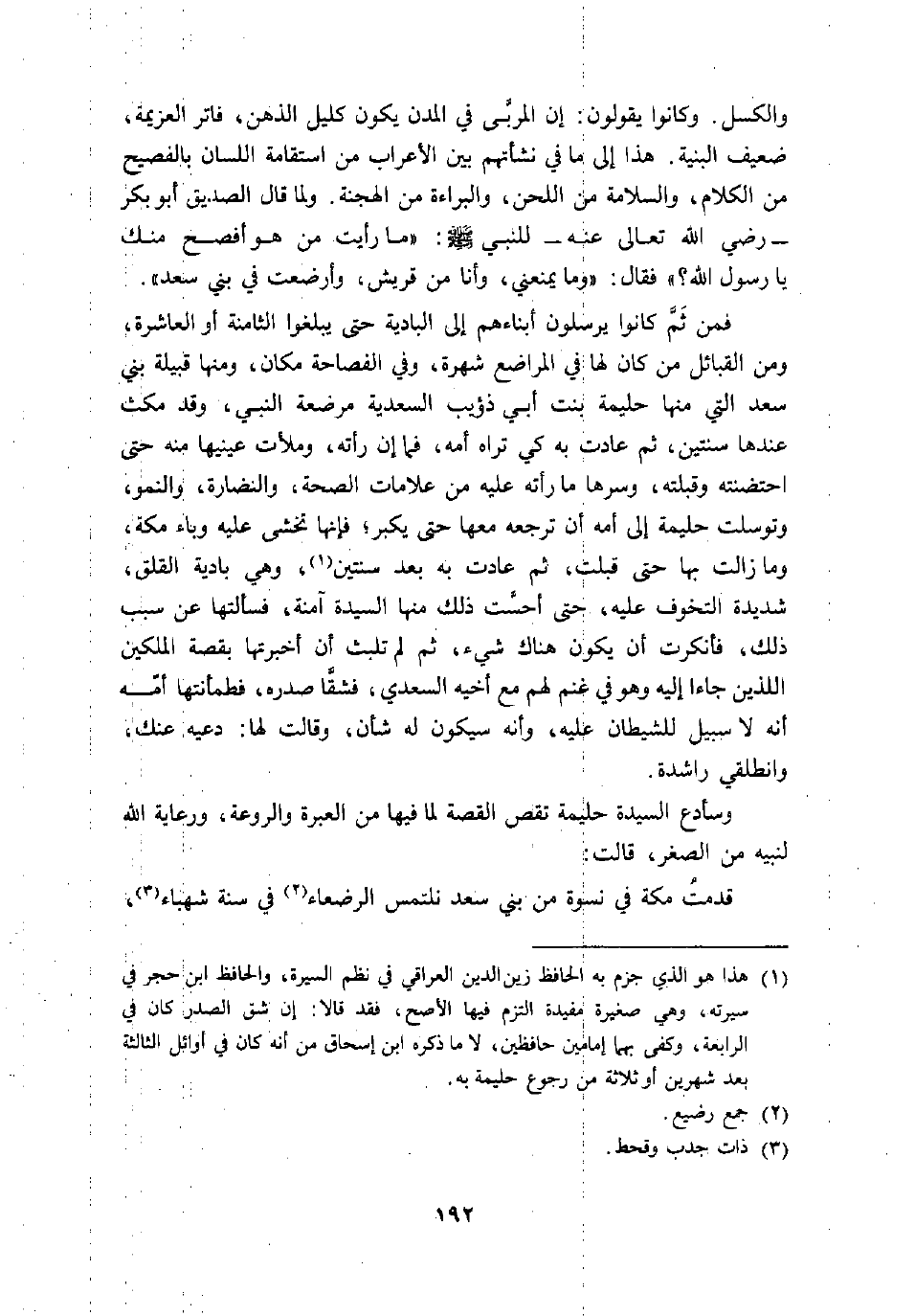 (1) هذا هو الذي جزم به الحافظ زين الدين العراقي في نظم السيرة، والحافظ ابن حجر في سيرته، وهي صغيرة مفيدة التزم فيها الأصح، فقد قالا: إن شق الصدر كان في الرابعة، وكفى بهما إمامين حافظين، لا ما ذكره ابن إسحاق من أنه كان في أوائل الثالثة بعد شهرين أو ثلاثة من رجوع حليمة به.