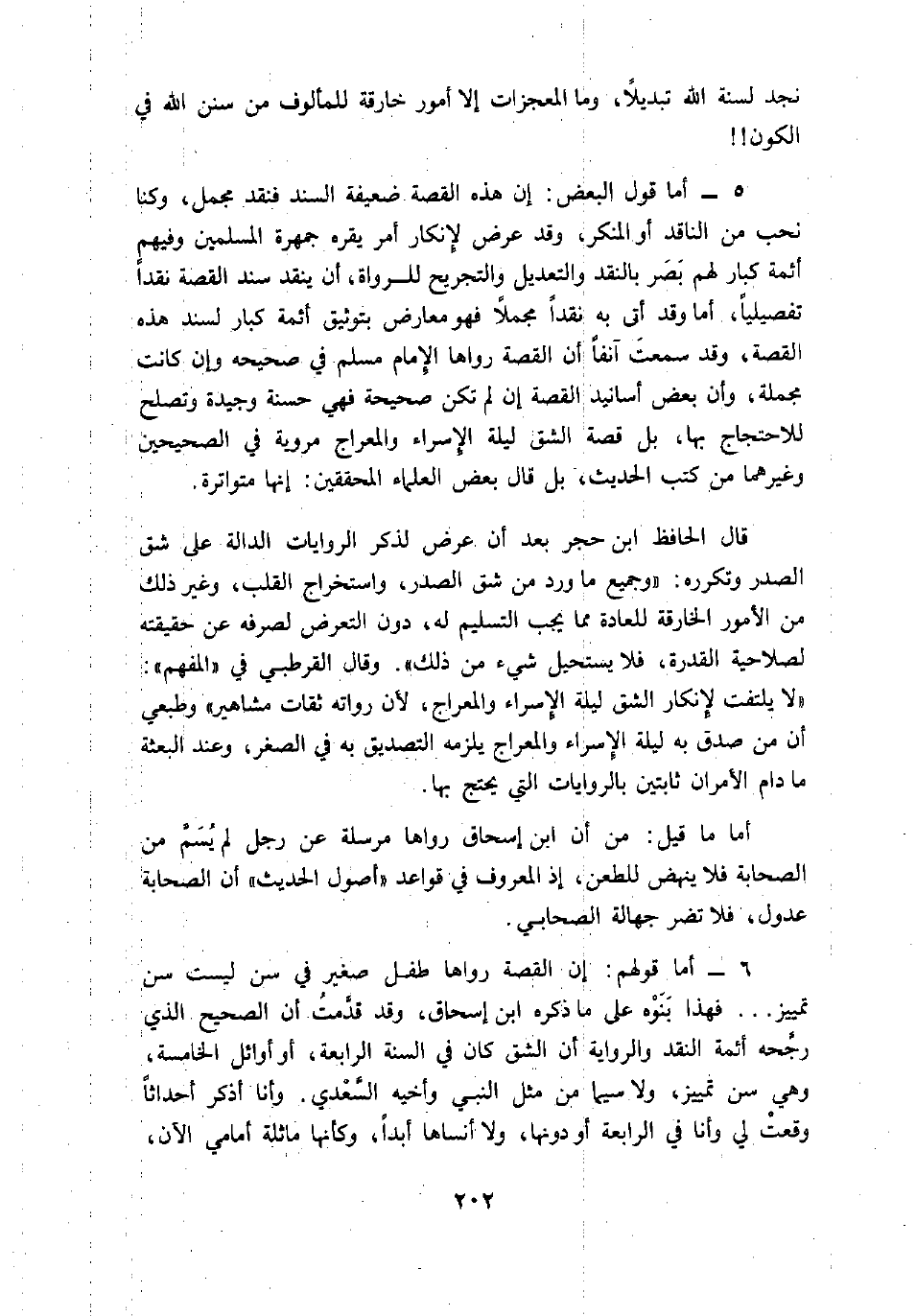5- أما قول البعض: إن هذه القصة ضعيفة السند فنقد مجمل، وكنا نحب من الناقد أو المنكر، وقد عرض لإنكار أمر يقره جمهرة المسلمين وفيهم أئمة كبار لهم بصر بالنقد والتعديل والتجريح للرواة، أن ينقد سند القصة نقدا تفصيليا، أما وقد أتى به نقدا مجملا فهو معارض بتوثيق أئمة كبار لسند هذه القصة، وقد سمعت انفا أن القصة رواها الإمام مسلم في صحيحه وإن كانت مجملة، وأن بعض أسانيد القصة إن لم تكن صحيحة فهي حسنة وجيدة وتصلح للاحتجاج بها، بل قصة الشق ليلة الإسراء والمعراج مروية في الصحيحين وغيرهما من كتب الحديث، بل قال بعض العلماء المحققين: إنها متواترة.