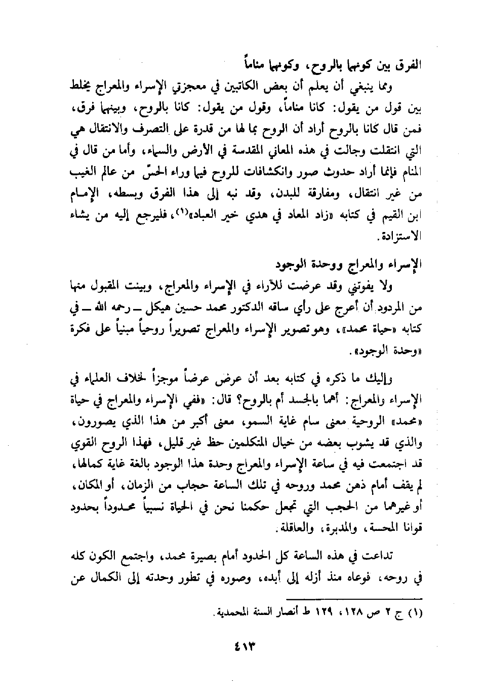 ولا يفوتني وقد عرضت للاراء في الإسراء والمعراج، وبينت المقبول منها من المردود أن أعرج على رأي ساقه الدكتور محمد حسين هيكل- رحمه الله- في كتابه «حياة محمد» ، وهو تصوير الإسراء والمعراج تصويرا روحيا مبنيا على فكرة «واحدة الوجود» .